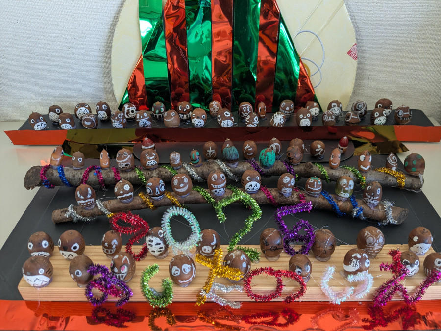 いろんな形のどんぐりをゲットして、個性豊かな顔のどんぐりのオブジェができました。
