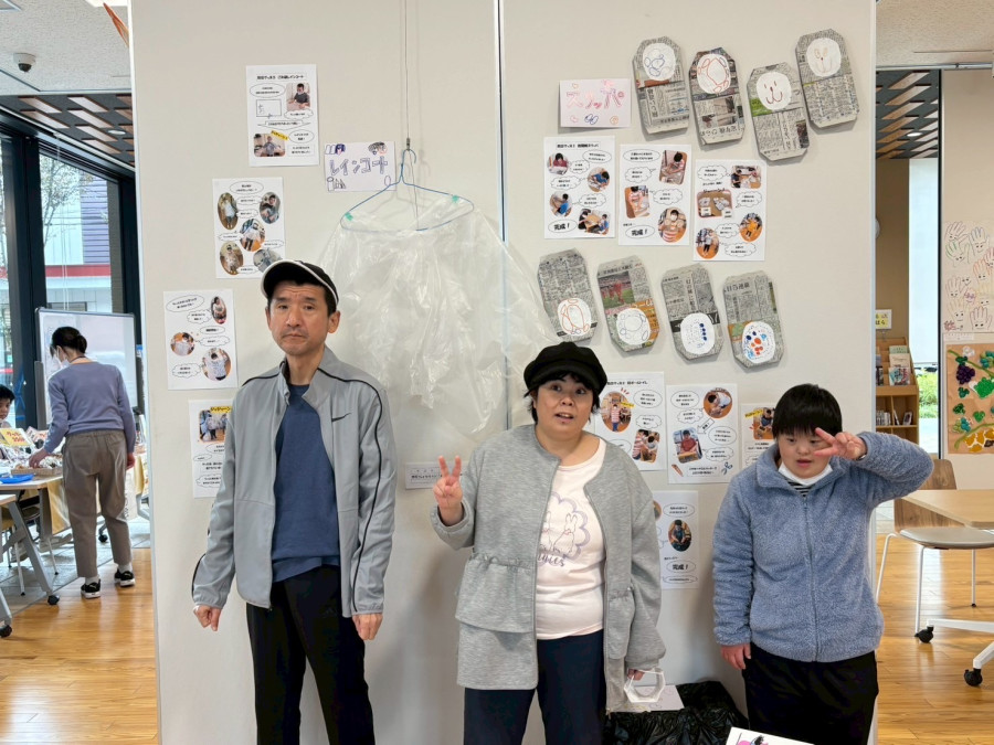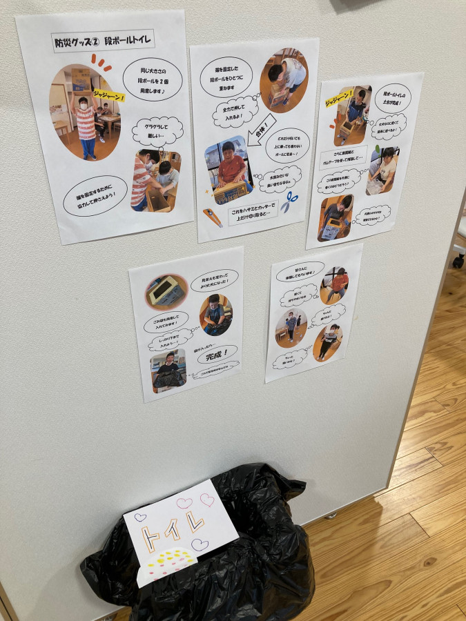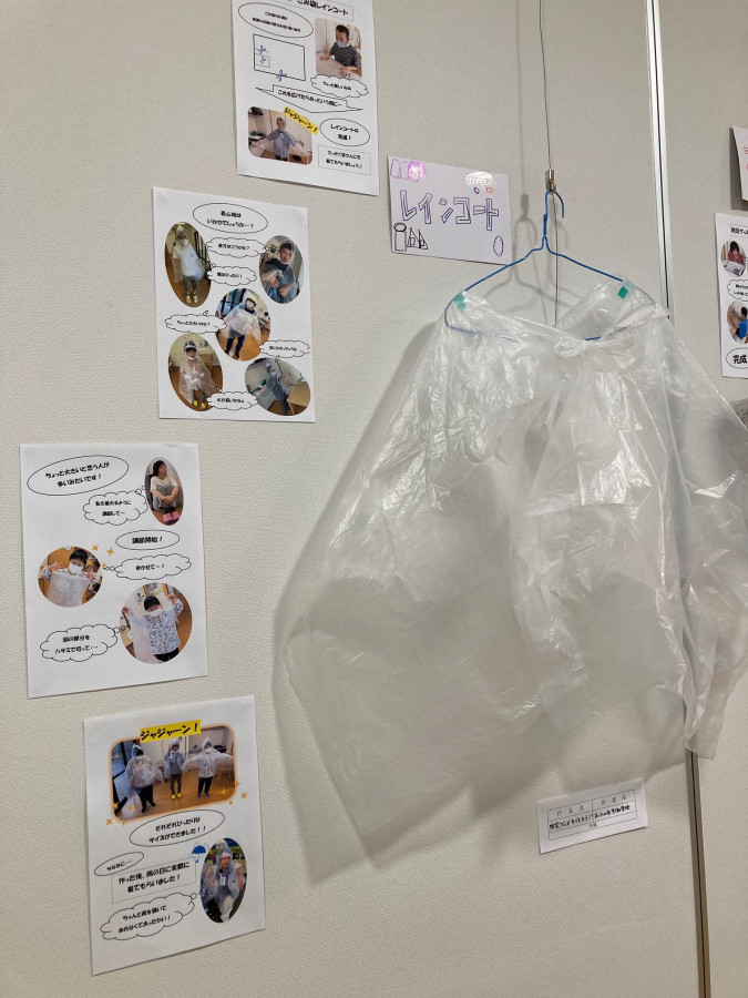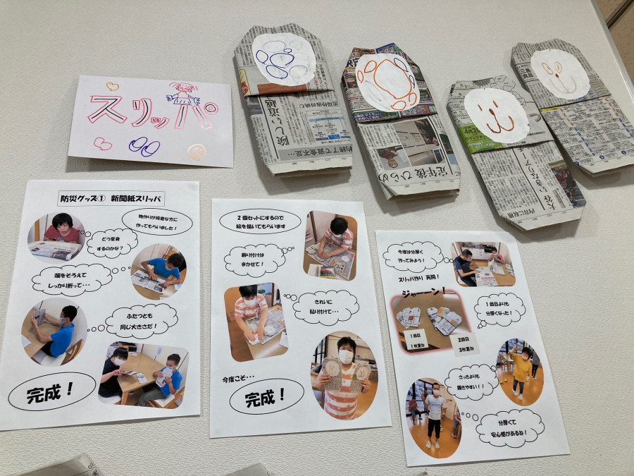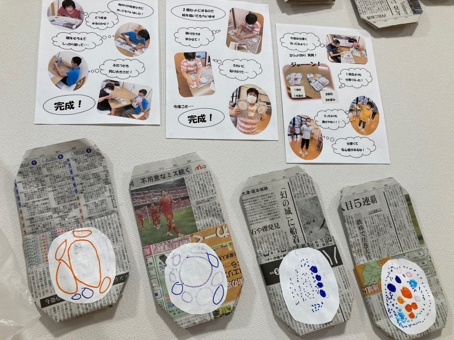 新聞紙やビニール袋で、レインコート・スリッパ・トイレを作ってみました。