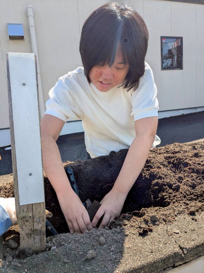 さつまいも掘りをしました。猛暑の影響か、今年は不作で収穫は宝探し状態でしたが、無事に掘り当てることができました。